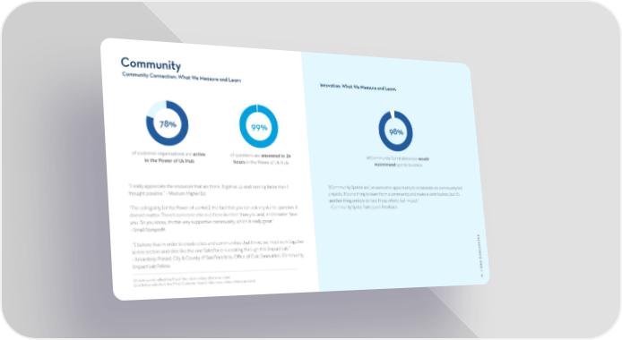 Community Community Connection: What We Measure and Learn Innovation: What We Measure and Learn 78% 99% 98% of customer organizations are active of questions are answered in 24 of Community Sprint attendees would in the Power of Us Hub hours in the Power of Us Hub recommend sprints to others “I really appreciate the resources that are there. It got us up and running faster than I “[Community Sprints are] an awesome opportunity to collaborate on community-led thought possible.” - Medium Higher Ed projects. It’s one thing to learn from a community and make a contribution, but it’s another thing entirely to have those efforts fuel impact.” “The collegiality [of the Power of us Hub], the fact that you can ask any dumb question, it - Community Sprint Participant Feedback doesn't matter. There's someone else out there dumber than you and, and smarter than you. So you know, it's this very supportive community, which is really great.” - Small Nonprofit S “I believe that in order to create cities and communities that thrive, we must work together ALE across sectors and silos like the one Salesforce is creating through this Impact Lab.” SF - Amardeep Prasad, City & County of San Francisco, Office of Civic Innovation, Community ORCE. Impact Lab Fellow ORG / 1 All data points reflect the Fiscal Year 2020 unless otherwise noted Qualitative data from the FY20 Customer Impact Interviews, unless otherwise noted 9