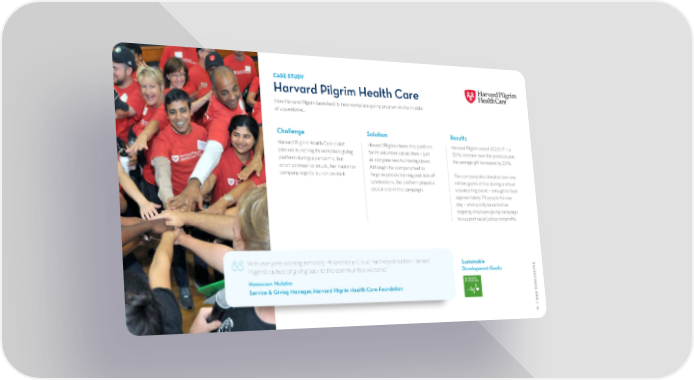 CASE STUDY Harvard Pilgrim Health Care How Harvard Pilgrim launched its new workplace giving program in the middle of a pandemic. Challenge Solution Results Harvard Pilgrim Health Care didn’t Harvard Pilgrim chose this platform Harvard Pilgrim raised $62,017 – a plan on launching its workplace giving for its volunteer capabilities – just 32% increase over the previous year, platform during a pandemic, but as everyone was hunkering down. the average gift increased by 23%. when coronavirus struck, the insurance Although the company had to company kept its launch on track. forgo in-person training and kick-off The company also donated over one celebrations, the platform played a million grains of rice during a virtual crucial role in the campaign. volunteering event – enough to feed approximately 70 people for one day – and quickly launched an ongoing employee giving campaign to support racial justice nonprofits. With everyone working remotely, Philanthropy Cloud has helped sustain Harvard Sustainable S Pilgrim’s culture of giving back to the communities we serve.” Development Goals: ALE “ SF Henocson Mulatre ORCE. Service & Giving Manager, Harvard Pilgrim Health Care Foundation ORG / 1 5