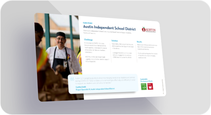 CASE STUDY Austin Independent School District How Austin Independent School District Quickly Raised Funds to Support Students, Families & Teachers. Challenge Solution Results In response to COVID-19, Austin Immediately following school closures, Raised over $2M and distributed more Independent School District (AISD) AISD created a crisis support campaign than 473K meals to low-income had to quickly understand the needs in Salesforce. students and families. of students, families and teachers districtwide. Leveraged Pardot to communicate Continually tracking data from donors with and engage donors and over in Salesforce to ensure emerging AISD found that additional funds 5,500 teachers across the district. needs are met. urgently needed to be raised to support those impacted. Austin ISD is adapting quickly to serve the emerging needs of our students and families Sustainable during COVID-19. Pardot enables us to communicate effectively and efficiently in order S “to support our students and school communities.” Development Goals: ALE SF Cynthia Smith ORCE. Project Specialist III, Austin Independent School District ORG / 3 4