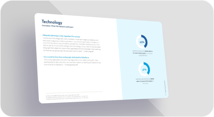 Technology Innovation: What We Measure and Learn Adequate planning is a key ingredient for success “I think one of the things that’s really important is to do your mapping in advance and 43% that’s quite a big process. And people think ‘I need it for this and I need it for that and I need it for this and we can just add this and add that’. And that’s not how you do it. You have to start at, it’s almost like writing a business strategy. Like you have to map the whole thing right from what’s the vision of the organization and then breaking it down and okay, customers say they are better able to but how are you going to get the data and insert the data?” - Small Nonprofit set and monitor goals as a result of using Salesforce It is crucial to have time and people dedicated to Salesforce “If it’s a tiny organization like mine is as long as the person who’s looking after it has, that flexibility to determine their own work and, make sure that they are allowed to have time to focus on Salesforce.” - Emerging Nonprofit 41% customers say that they are better able to measure the impact of S their work ALE SF ORCE. ORG / 1 All data points reflect the Fiscal Year 2020 unless otherwise noted Quantitative data from Tech for Social Change Survey, administered June-July 2020 Qualitative data gathered through Impact Interviews September 2019 - January 2020 4