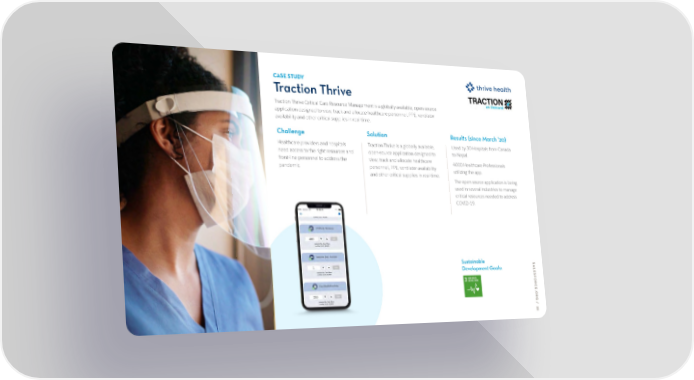 CASE STUDY Traction Thrive Traction Thrive Critical Care Resource Management is a globally available, open-source application designed to view, track and allocate healthcare personnel, PPE, ventilator availability and other critical supplies in real-time. Challenge Solution Results (since March ‘20) Healthcare providers and hospitals Traction Thrive is a globally available, Used by 30 Hospitals from Canada need access to the right resources and open-source application designed to to Nepal. front-line personnel to address the view, track and allocate healthcare 4000 Healthcare Professionals pandemic. personnel, PPE, ventilator availability utilizing the app. and other critical supplies in real-time. The open source application is being used in several industries to manage critical resources needed to address COVID-19. Sustainable S Development Goals: ALE SF ORCE. ORG / 3 3