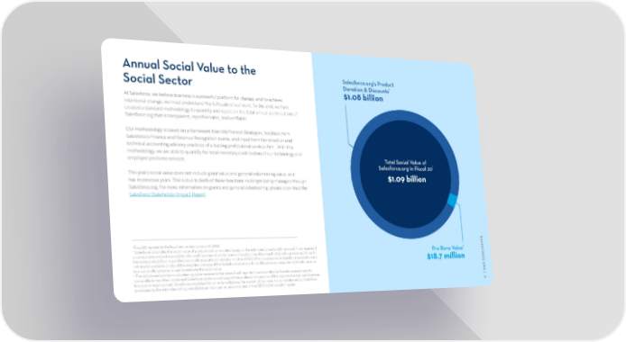 Annual Social Value to the Salesforce.org's Product 2 Social Sector Donation & Discounts $1.08 billion At Salesforce, we believe business is a powerful platform for change, and to achieve intentional change, we must understand the full scale of our work. To this end, we have created a standard methodology to quantify and report on the total annual contributions of Salesforce.org that is transparent, reperformable, and verifiable. Our methodology is based on a framework from McPherson Strategies, feedback from Salesforce's Finance and Revenue Recognition teams, and input from the valuation and technical accounting advisory practices of a leading professional services firm. With this methodology, we are able to quantify the total monetary contribution of our technology and employee pro bono services. Total Social Value of Salesforce.org in Fiscal 201 This year's social value does not include grant value and general volunteering value, as it $1.09 billion has in previous years. This is due to both of these functions no longer being managed through Salesforce.org. For more information on grants and general volunteering, please download the Salesforce Stakeholder Impact Report. S 1 Fiscal20 represents the fiscal year ended January 31, 2020. ALE 2 Salesforce calculates the social value of products sold or donated based on the estimated price Salesforce would have received if 3 SF a comparable product was sold to a for-profit business of similar size and location, less the price that Salesforce received, if any, for Pro Bono Value the same product from a qualified non-profit, educational institution or other NGO. When a comparable Salesforce product price is $18.7 million ORCE. not readily available, a ratio of the weighted average of the Salesforce price to a for-profit company compared to Salesforce price to a non-profit company is used to estimate the social value. 3 The skills based pro-bono volunteering value represents the value of self reported hours donated by Salesforce employees to ORG / 8 non-profits to help them implement Salesforce solutions and support the professional capacity of the organization (i.e. board service, financial or legal counsel). Salesforce calculates this value by multiplying the number of pro-bono hours volunteered by Salesforce employees by the estimated billing rate of $195 per hour per as recommended in the CECP 2020 valuation guide.