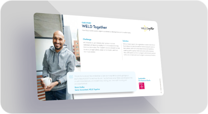 CASE STUDY WELD Together How WELD Seattle scaled program operations by reducing time spent on admin tasks. Challenge Solution WELD Seattle equips criminal justice system-impacted With pro bono support, the organization created online forms individuals with housing, employment, and resources to help for employers to post jobs and for clients to apply for jobs on them re-enter society. The nonprofit needed a streamlined way their website. Both forms feed data directly into Salesforce, to collect job applications, assign workers to jobs, and track enabling staff to quickly match job seekers with employers. their hours worked. Now, staff spend less time on program administration and are better able to track and report program outcomes to funders. The pro bono project has enabled us to take our nonprofit to scale by giving us a way to keep track of the work we do and the clients we serve. We’re spending less time Sustainable S “on administrative tasks and more time providing our clients with housing and Development Goals: ALE job opportunities.” SF Raven Dudley ORCE. Senior Accountant, WELD Together ORG / 2 6