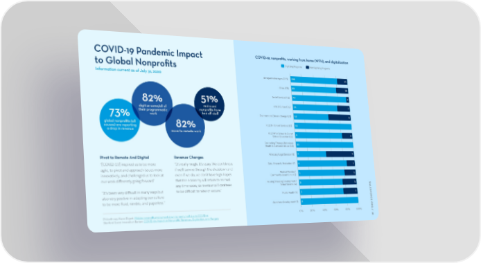 COVID-19 Pandemic Impact COVID-19, nonprofits, working from home (WFH), and digitalization to Global Nonprofits Digitizing Programs Not Digitizing Programs Information current as of July 31, 2020 All organization types (233) 190 43 Other (75) 59 16 82% 51% Social Services (42) 40 2 digitize some/ all of mid-sized Arts & Culture (31) 24 7 their programmatic nonprofits have 73% work laid off staff Environment/Climate Change (20) 12 8 global nonprofits (all K-12/In-School Services (13) 13 causes) are reporting 82% a drop in revenue move to remote work K-12/After School & Out of 9 2 School Education (11) Counseling/Therapy/Behavioral 10 Health & Substance Abuse (10) Revenue Changes Advocacy/Legal Services (8) 4 4 Pivot to Remote And Digital “[COVID-19] inspired us to be more “It’s really rough. It’s scary. We don’t know Data, Research, Evaluation (7) 6 1 agile, to pivot and approach issues more if we’ll survive through the shutdown and innovatively, and challenged us to look at even if we do, we don’t have high hopes Medical Provider/ 4 1 Community-Based Clinic (5) our work differently going forward” that the economy will return to normal Housing/Housing Development/ 3 1 S any time soon, so revenue will continue Rental Services (4) ALE “It’s been very difficult in many ways but to be difficult to raise or secure.” Public Health (4) 3 1 SF also very positive in adapting our culture ORCE. to be more fluid, nimble, and paperless.” Workforce Development (3) 3 ORG / 2 Philanthropy News Digest: Midsize nonprofit employment down by nearly half due to COVID-19 0% 20% 40% 60% 80% 100% Stanford Social Innovation Review: COVID-19’s Impact on Nonprofits’ Revenues, Digitization, and Mergers 8